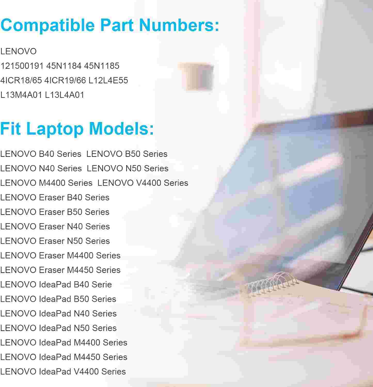 - Compatible Laptop Models: Perfect replacement for Lenovo N40, N40-30, N40-45, N40-70, N50, M4400, M4450, V4400, V4, and Eraser B40, B50, B50-30 Touch, B50-45, B50-70, IdeaPad N Series.
