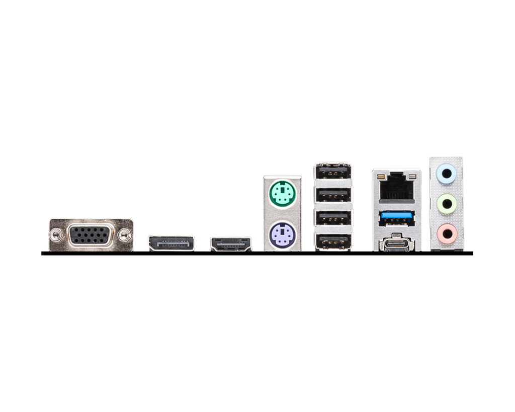 • Rear I/O: HDMI, DisplayPort, VGA outputs; USB 3.2 Gen2 Type-C; USB 3.2 Gen1 and USB 2.0 ports