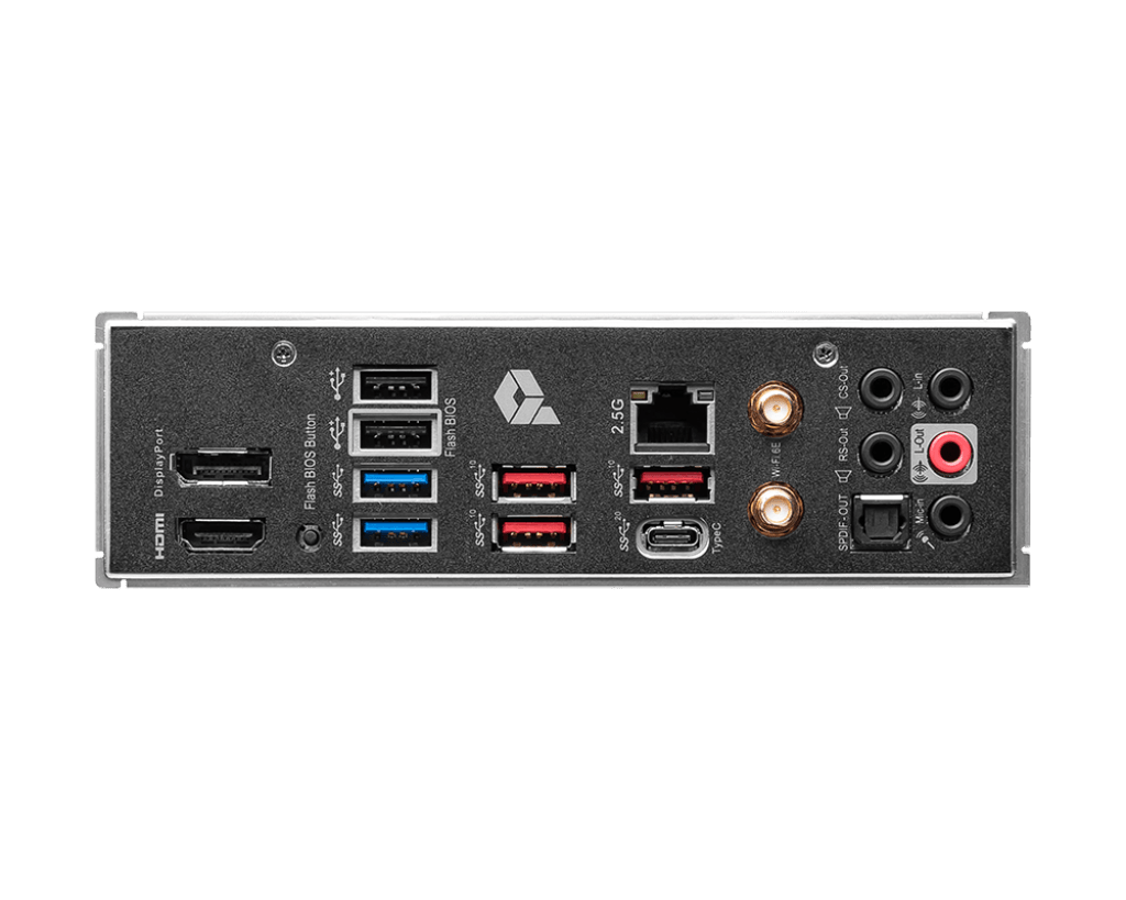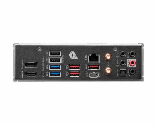 • Rear I/O includes USB 3.2 Gen2×2 Type‑C, USB 3.2 Gen2, USB 3.2 Gen1, HDMI, DisplayPort, and audio jacks